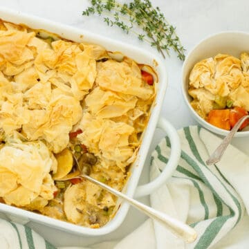 Chicken pot pie casserole is the ultimate comfort food recipe — but this one has a healthier twist. It’s made with whole ingredients, including lean chicken breast, six different types of vegetables, a homemade herb-flavored cream sauce, and a light, crispy phyllo dough crust.