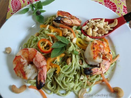 I tossed it with pasta, added some raw shredded carrots, colorful peppers, and scallions, and topped it with grilled shrimp. Iām kind of sad that I have to wait another year for garlic scapes, but this recipe will work with regular garlic cloves as well.