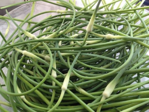 - 12 garlic scapes or 2 large garlic cloves