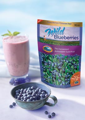 The small blueberries are wild blueberries, and they really are wildly different from the larger, cultivated blueberries you find in your produce department. They’re grown naturally in Maine, eastern Canada and Quebec, and they have twice the antioxidants of cultivated blueberries. Wild blueberries also have a more intense blueberry taste, and deeper color (and FYI it’s the color that gives them the antioxidants). Because they’re frozen at harvest, these beauties are available all year round.
